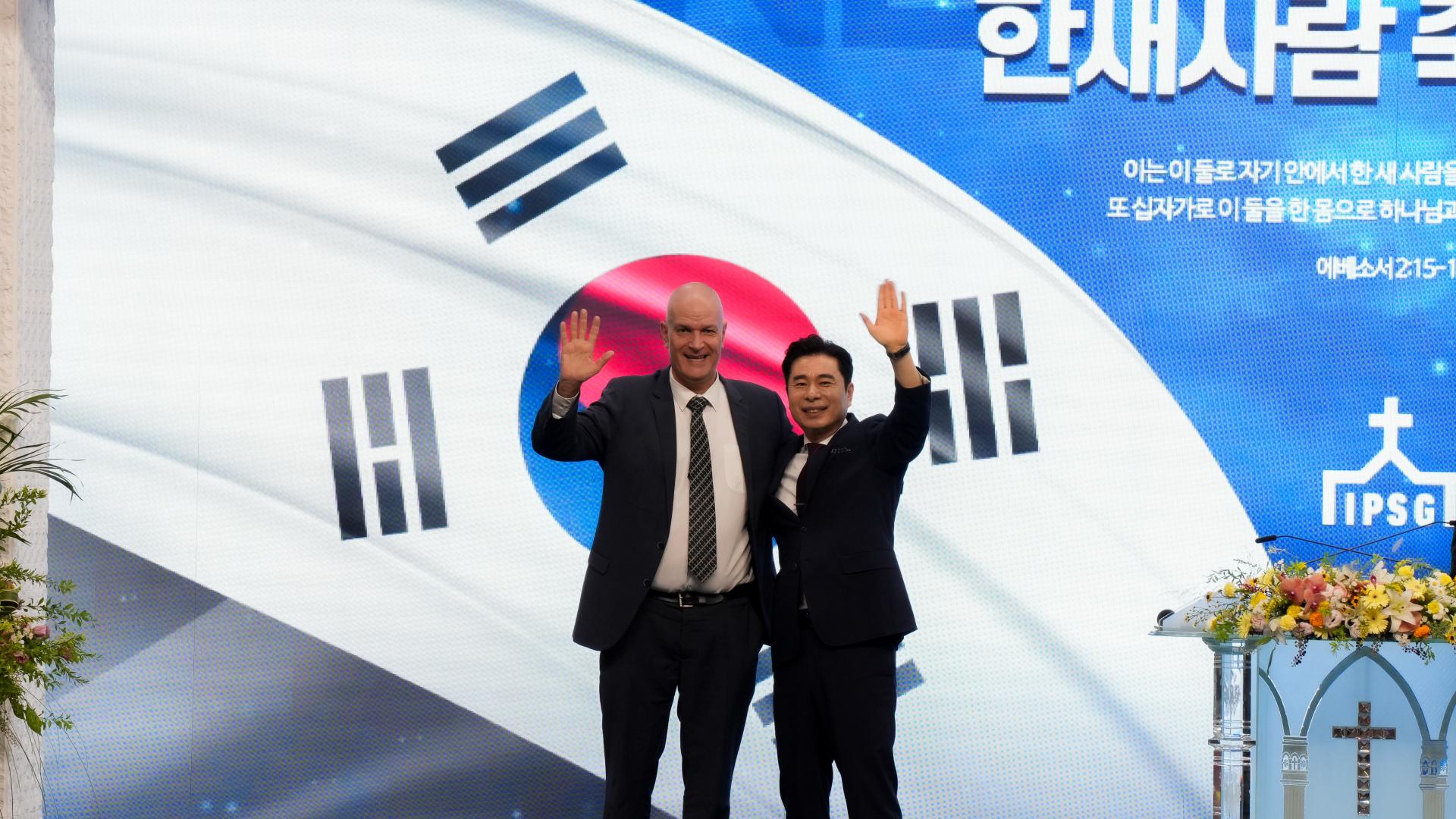 라파엘 하르파즈(왼쪽) 주한 이스라엘 대사와 박영민 서울김포영광교회 목사가 지난 7일 경기도 김포 서울김포영광교회 예배당에서 어깨동무를 하고 손을 흔드는 모습