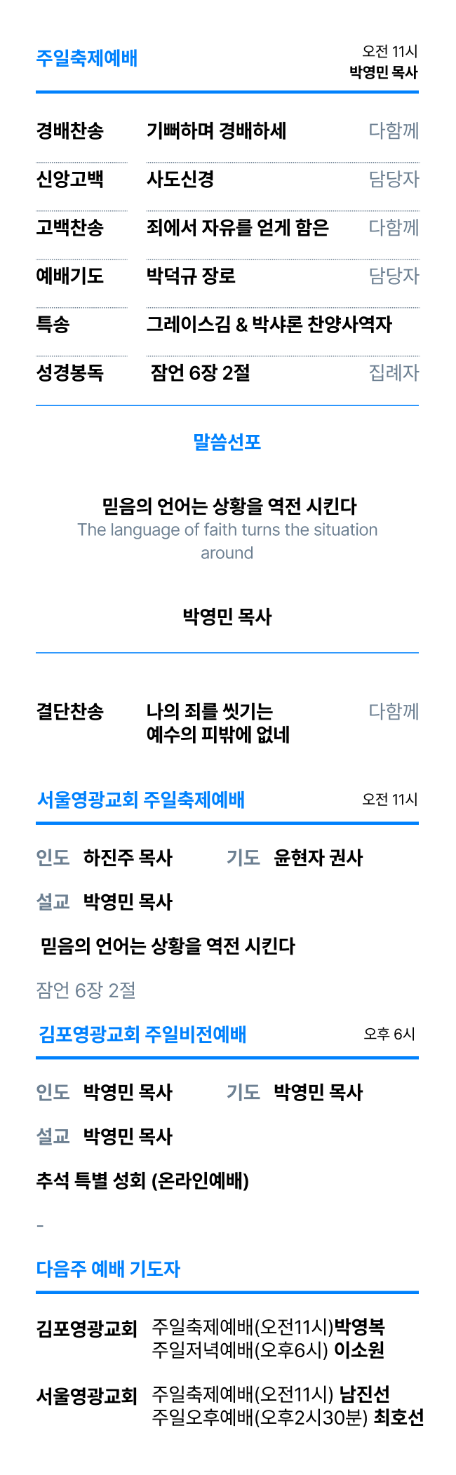 이번 주도 믿음의 언어, 생명의 언어를 고백하며 가정과 교회와 나라가 하나님의 능력 안에서 새롭게 되는 은혜를 누리시길 축복합니다.